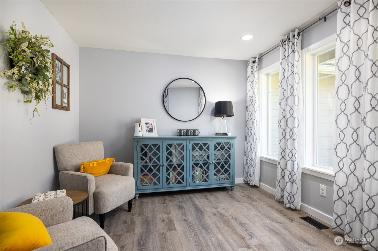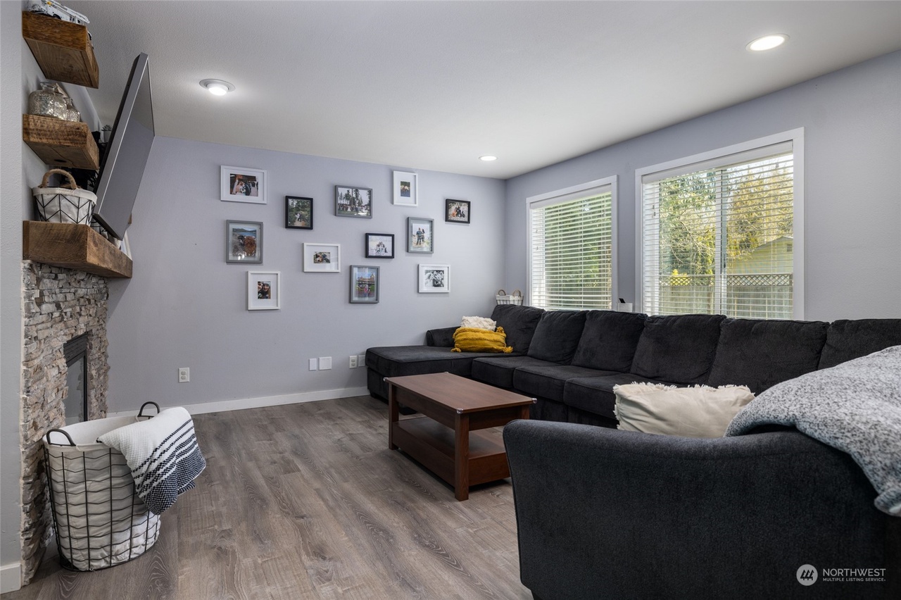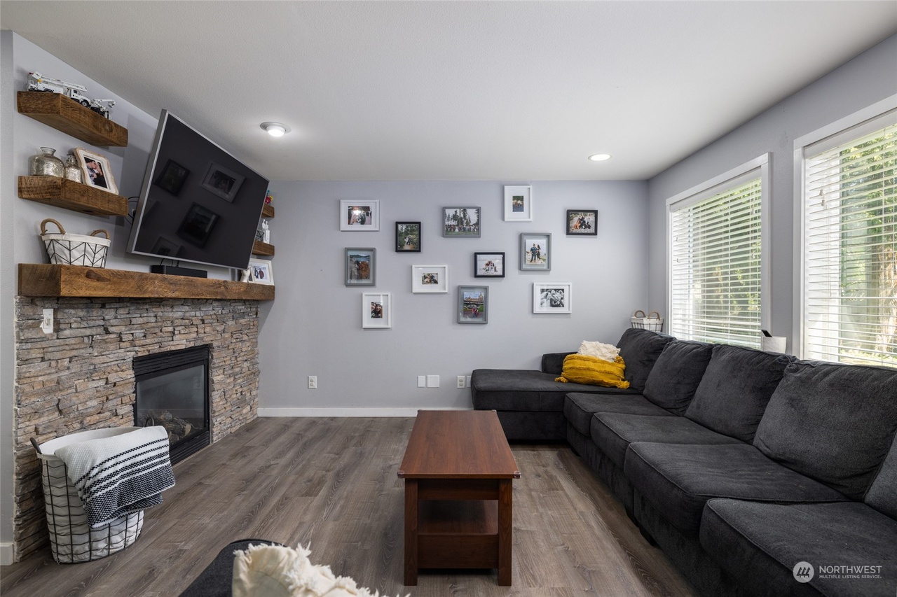 This 3+ bedroom, 3-bath home with 1889 sq ft sits on two spacious corner lots at the end of a cul-de-sac, offering a mountain view. The kitchen boasts granite-tiled countertops, stainless steel appliances, and a pantry. The living room features a propane fireplace with stack stone surround. A bonus room on the main level serves as an ideal office/den. Upstairs, find well-appointed bedrooms, including a primary bedroom with an en suite. The home includes a 3-car garage with epoxy floors, tankless hot water heater, and a fully fenced backyard with a concrete patio. Enjoy Glenhaven amenities like a seasonal pool, clubhouse, and two lakes.