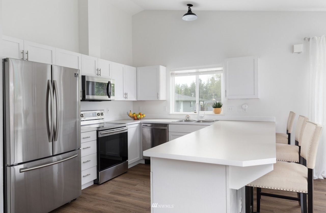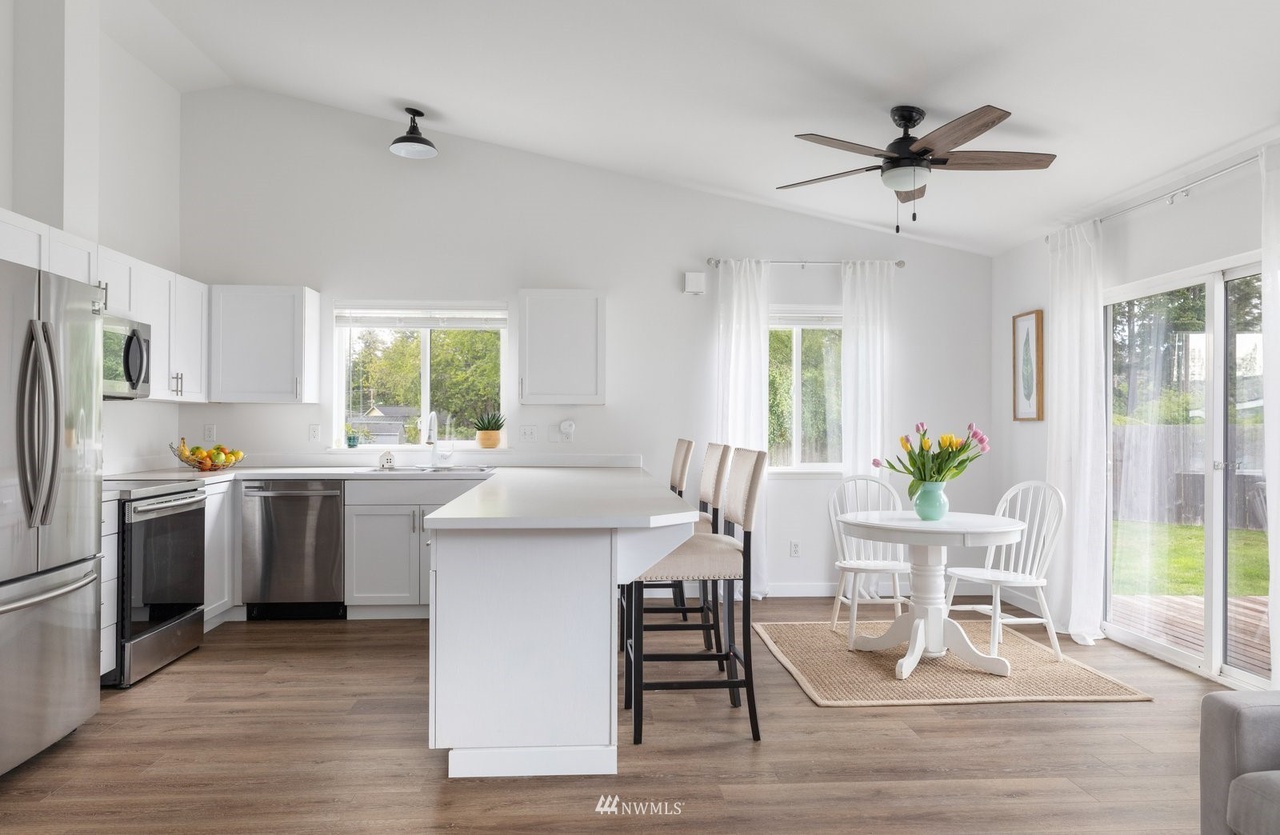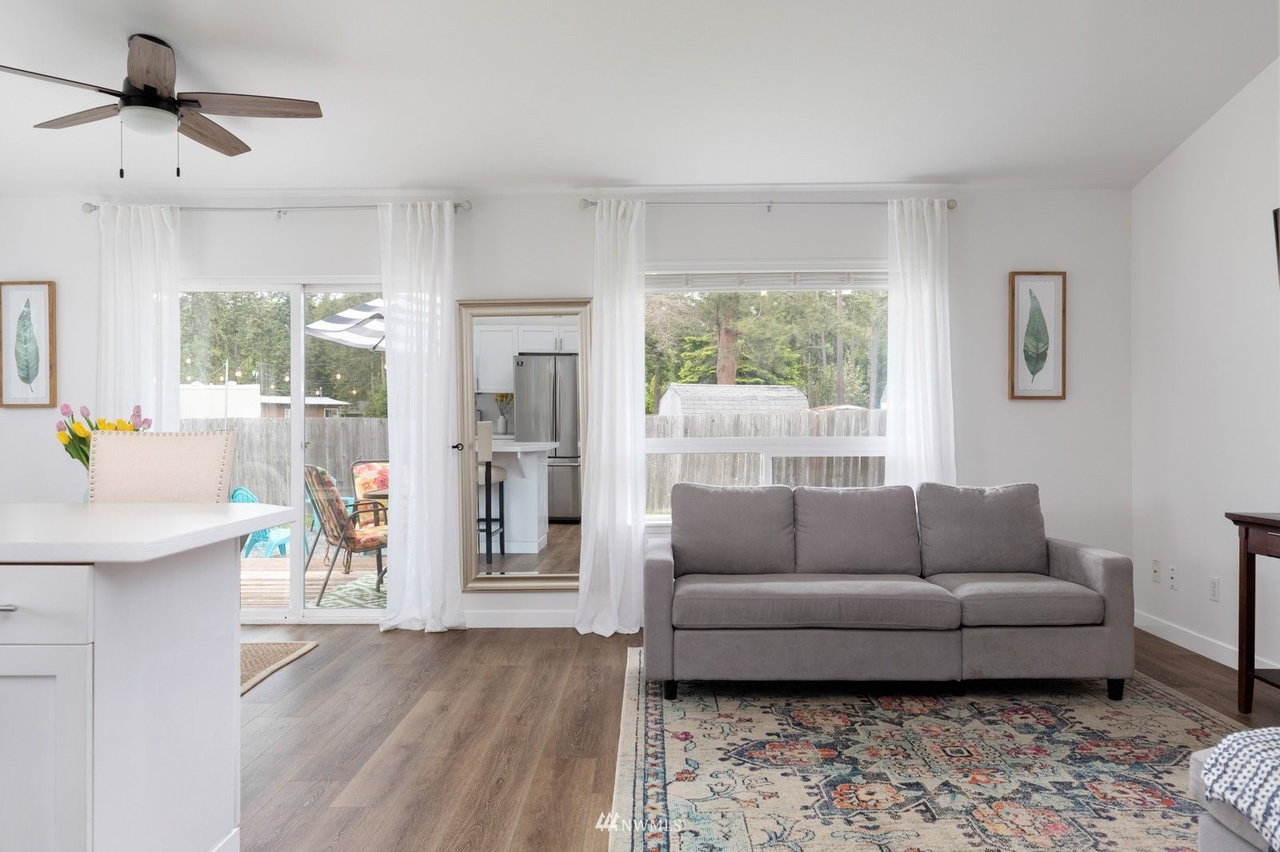 This updated single-level 2 bed, 2 bath home on a large fenced lot, minutes from the beach and community pool, boasts stunning mountain views from the vaulted-ceiling front room. Recent flooring, fresh paint, stainless appliances, and renovated bathrooms elevate its charm. The open-concept kitchen leads to a deck with a fire pit. The spacious primary bedroom features an ensuite and walk-in closet. Ideal for starters, renters, or forever home seekers, this property blends modern updates with a flooring-focused aesthetic.