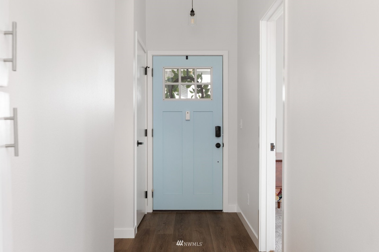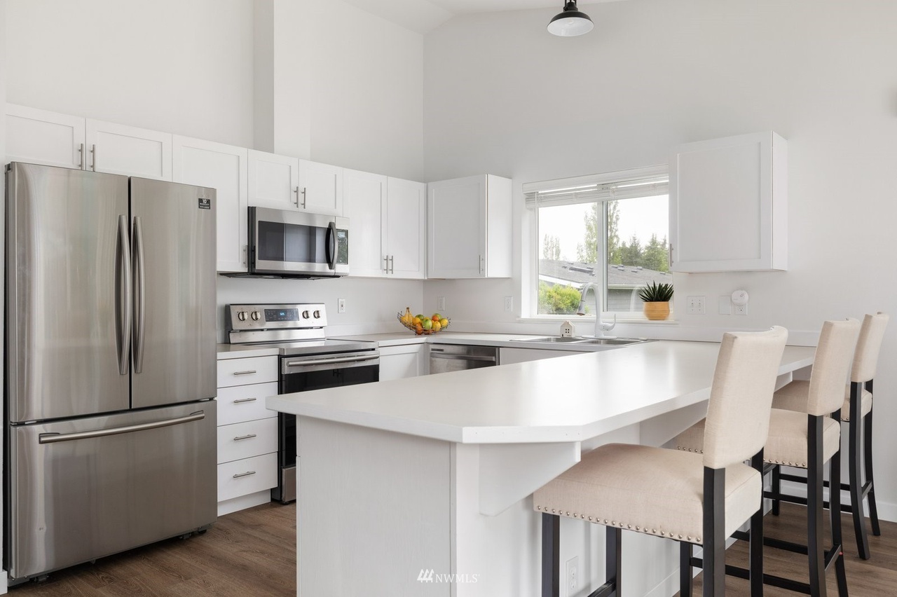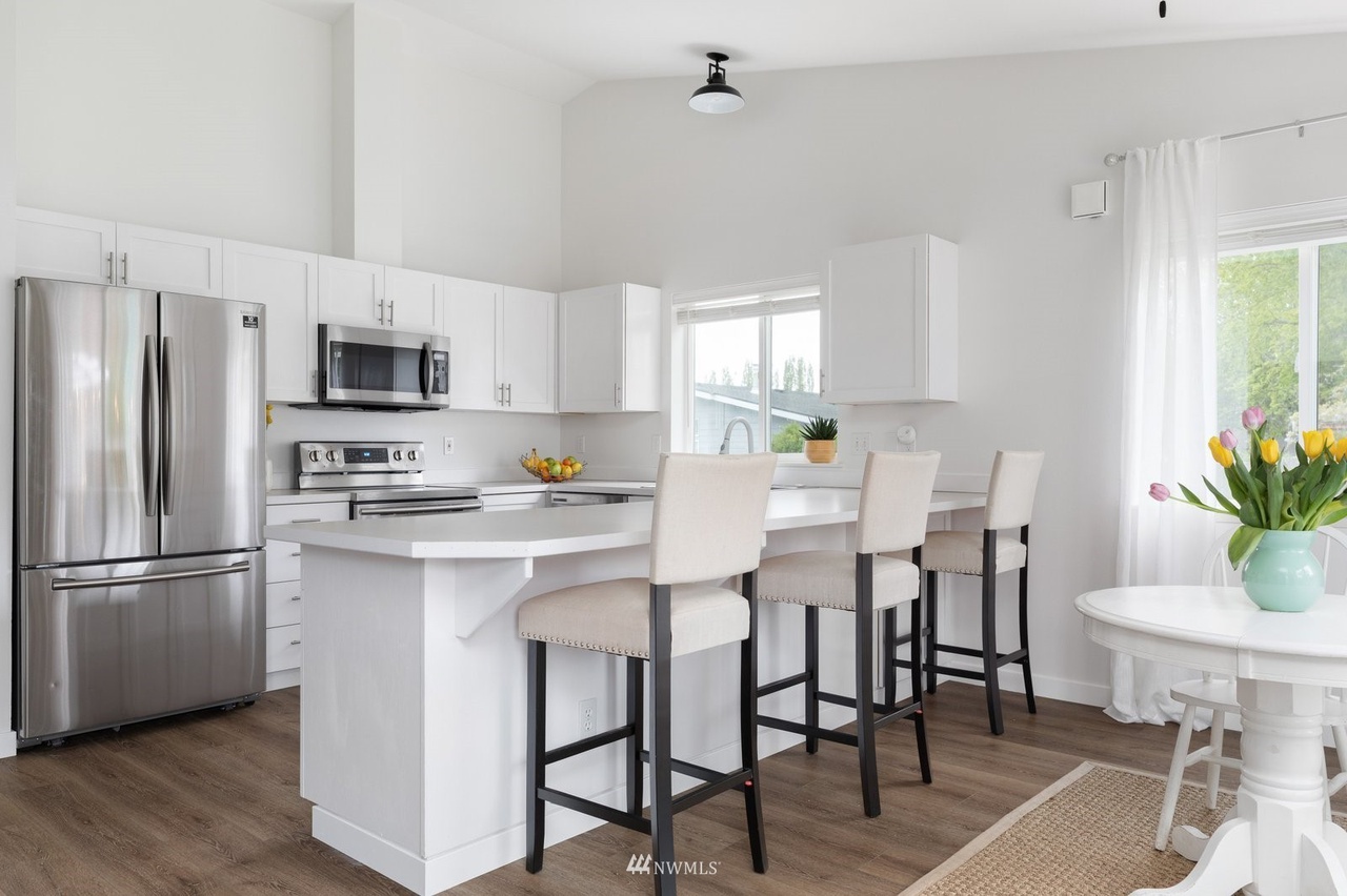 This updated single-level 2 bed, 2 bath home on a large fenced lot, minutes from the beach and community pool, boasts stunning mountain views from the vaulted-ceiling front room. Recent flooring, fresh paint, stainless appliances, and renovated bathrooms elevate its charm. The open-concept kitchen leads to a deck with a fire pit. The spacious primary bedroom features an ensuite and walk-in closet. Ideal for starters, renters, or forever home seekers, this property blends modern updates with a flooring-focused aesthetic.
